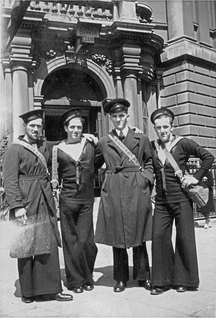 The same four in front of the Beaver Club, London: Fred Hollands, Landry, Galloway, Unknown.
