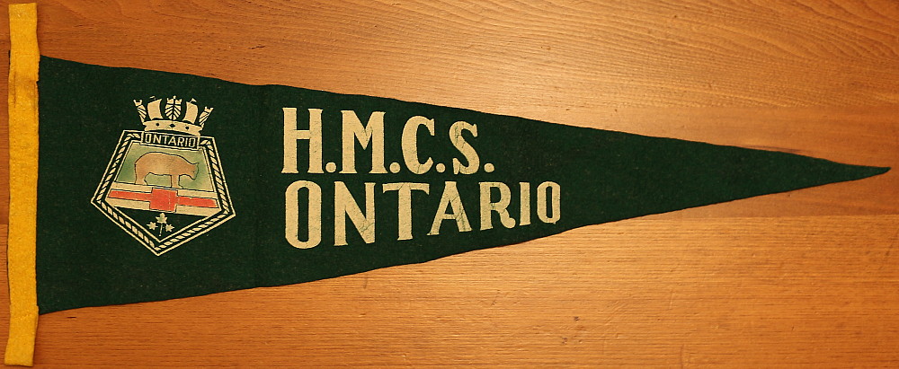 This badge was previously mounted on the cover of an album of HMCS Ontario photos, belonging to Russell Hodgkin's father. The crest measures 6-1/4 inches top to bottom, and 5-1/2 inches at the widest spot under the white ensign.
