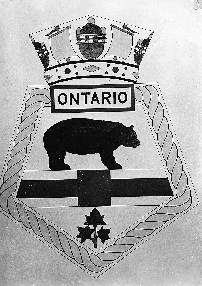 Russell Hodgkin, whose father served on the same voyage, emailed me in part: ". . . . the ship's emblem with the bear WAS the official emblem for the Ontario, during her maiden voyage and wartime service. The trillium became her emblem when she became a training vessel. "
