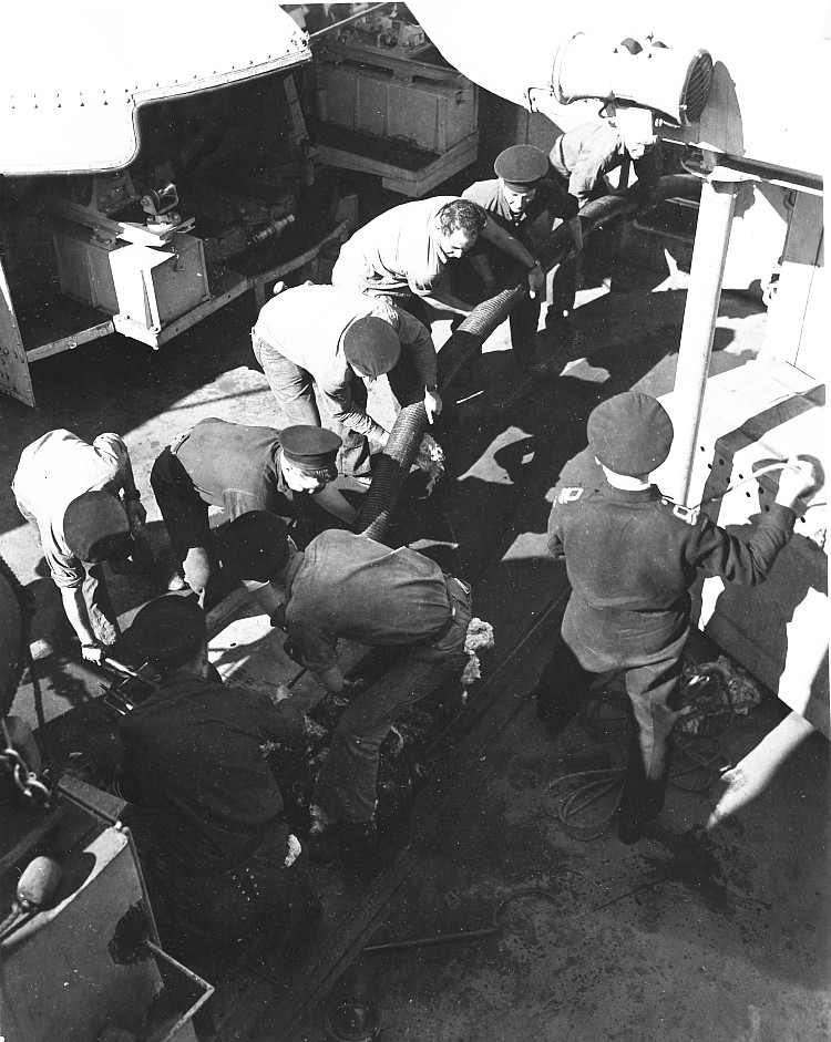 Negative ON-0017-7 : 13 July, 1945 : Showing consistant tension to be maintained to prevent hose dropping into the sea.