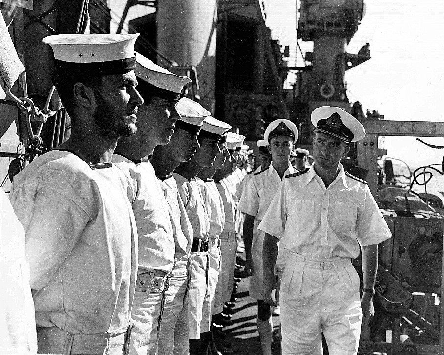 Being piped aboard is Vice-Admiral of Malta, Frederick Dalrymple-Hamilton. He became Vice-Admiral Malta and Flag Officer, Central Mediterranean, in April 1945.