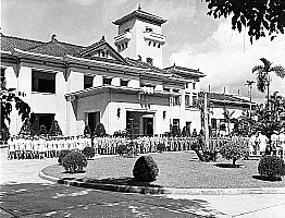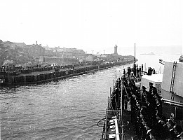 The RCN landing parties were re-embarked on relief by RN and Commando Units and on 28th October the ship sailed from Hong Kong for Manila on her first trip to Canada. Leaving Manila she sailed for Pearl Harbour, oiling enroute at Guam. From Pearl Harbour, where a stay of four days was made, Ontario set out on the final lap to Esquimalt, where she arrived on Tuesday, 27th November, 1945.