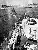 Leaving the Clyde again on 30th June, she sailed for Malta, there to complete her full working up programme. From Malta, the ship proceeded to Ceylon, calling enroute at Alexandria, Port Said and Aden.