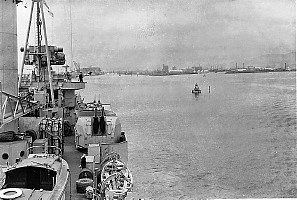 Leaving Trincomalee on the last day in August, the cruiser sailed for Hong Kong with HMS Glengyle and HMIS Llanstephan Castle in company. Passing through the Malacca Strait minefield in daylight, 5th September, rendezvous was made with the remaining ships of the convoy, including the Escort Carrier HMS Smiter and minesweepers of the 6th Minesweeping Flotilla, who swept ahead of the convoy through the Singapore Straits.