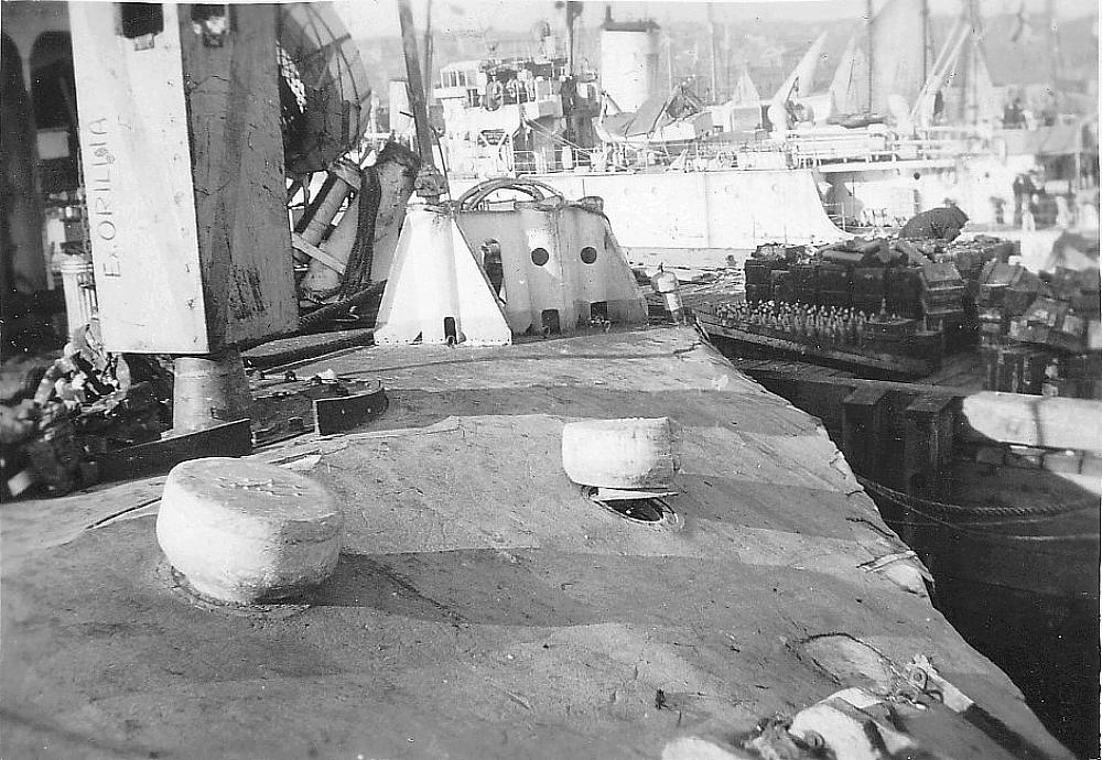 On the back of the photo is hand-written: "H.M.C.S. Nabob torpedoed and damaged severely by sub 115 miles from Sioux at 10:30 pm. Sioux displatched to rescue survivors". Editor's note: The aircraft carrier HMS Nabob was on loan to the RCN but was never officially given the "HMCS" designation. It had a mixed British (airmen) and Canadian (seamen) crew. It was torpedoed by a U-boat on August 22, 1944, with the loss of 11 RCN and 10 RN lives, but was able to slowly limp 1,600 km back home to safety. See The Legion Magazine for a more complete story.