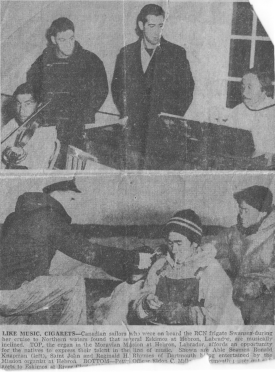 The caption reads: " LIKE MUSIC, CIGARETS -- Canadian sailors who were on board the RCN frigate Swansea during her cruise to Northern waters found that several Eskimos at Hebron, Labrador, are musically inclined. TOP, the organ in the Moravian Mission at Hebron, Labrador, affords an opportunity for the natives to express their talent in the line of music. Shown are Able Seamen Ronald Knapman (left), Saint John and Reginald H. Rhymes of Dartmouth being entertained by the Mission organist at Hebron. BOTTOM -- Petty Officer Eldon C. Mill(..) Dartmouth, passes out cigarets to Eskimos at River C(..) "